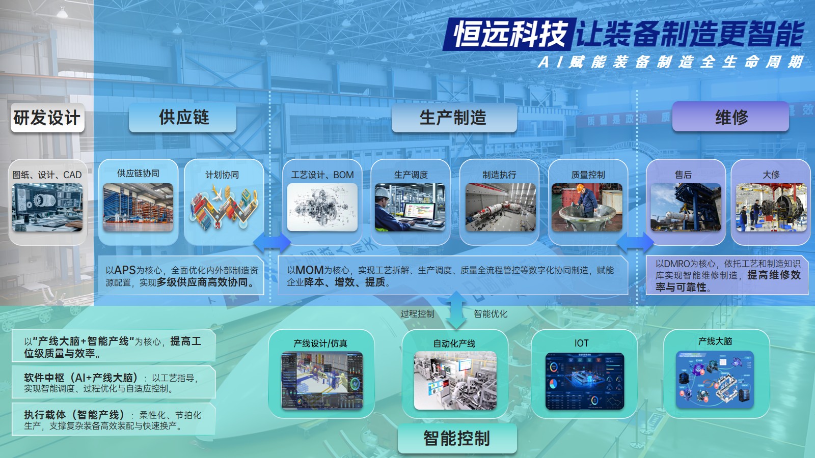 基于智能制造核心能力,恒遠(yuǎn)科技橫向延伸打造裝備全生命周期總集服務(wù),構(gòu)建產(chǎn)業(yè)鏈數(shù)字化協(xié)同平臺與覆蓋設(shè)備大修維護(hù)的全維運(yùn)維保障體系,形成貫穿研發(fā)設(shè)計、供應(yīng)鏈協(xié)同、生產(chǎn)制造到售后維修的完整價值鏈。